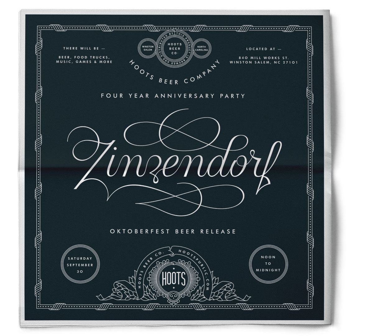 Zinzendorf is A special Oktoberfest beer produced by the good people of hoots. Named After a hotel that hosted some of winston’s fanciest guests, This Beer needed to look the part.